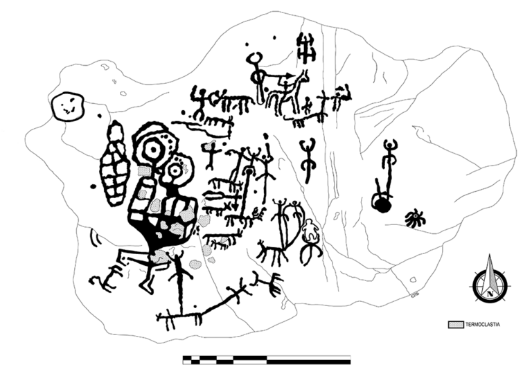 Amais hai de dez figuras antropomorfas de brazos e pernas curvas que nada teñen que ver coas figuras humanas da arte atlántica, de entre as pernas sáelle unha liña longa que en catro casos rematan nun cuadrúpede, no cervo e en dous posibles équidos (IND3, IND5).