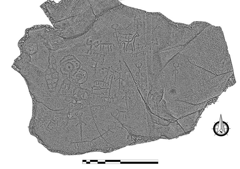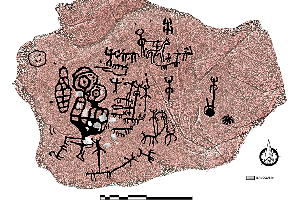 No centro da composición hai un cervo (CERV) rodeados por cánidos (C1, C2, C3, C4), tres homes (A11, A12, A13), todos con algún obxecto na man, incluso un (A11) deitada e no intre de lanzar unha frecha ou outra arma arreboladiza contra o animal. Sobre esta escena un home (A14) está enfrontado a un cuadrúpede (IND7, équido?) axudado por un cánido (C15). Unha terceira escena cinexética é a figura mellor conservada (E1), un équido montado por un antropomorfo no intre de arroxar unha lanza sobre un cuadrúpede (IND6, quizais équido) axudado polos antropomorfos A15 e A16.