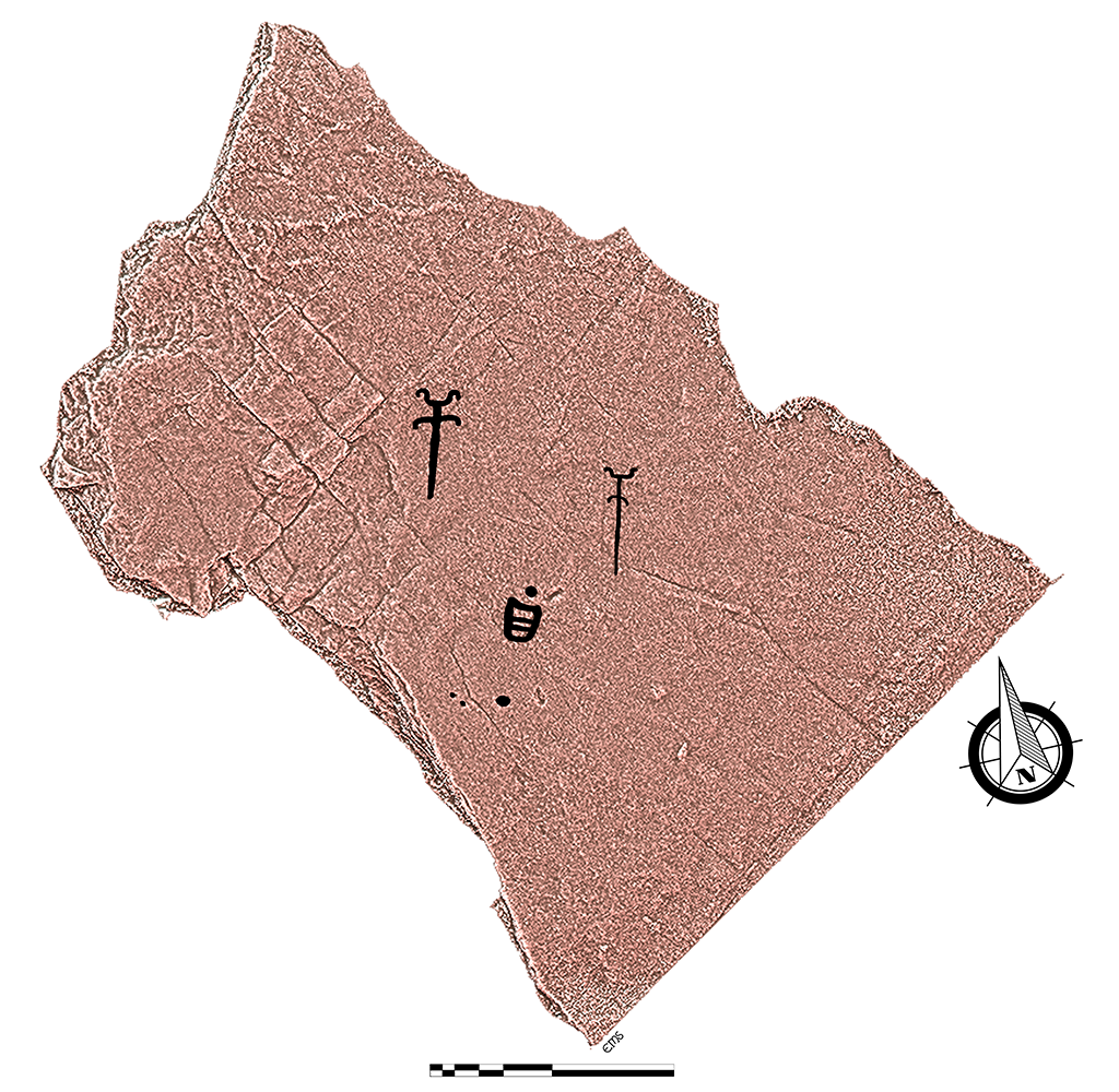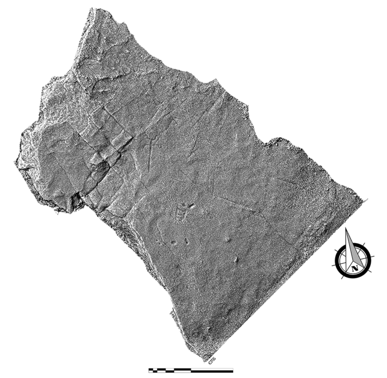 Rematamos o percorrido nunha laxe inmensa, tamén inclinada ó sur onde só aparecen gravadas catro coviñas, unha figura máis ou menos rectangular con tres divisións internas e dúas figuras antropomorfas cos brazos cara arriba coas mans a xeito de fouce e as pernas dunha figura máis curvas cara abaixo ca outra figura con elas máis abertas, máis perpendiculares ó tronco do que sae un longuísimo apéndice.